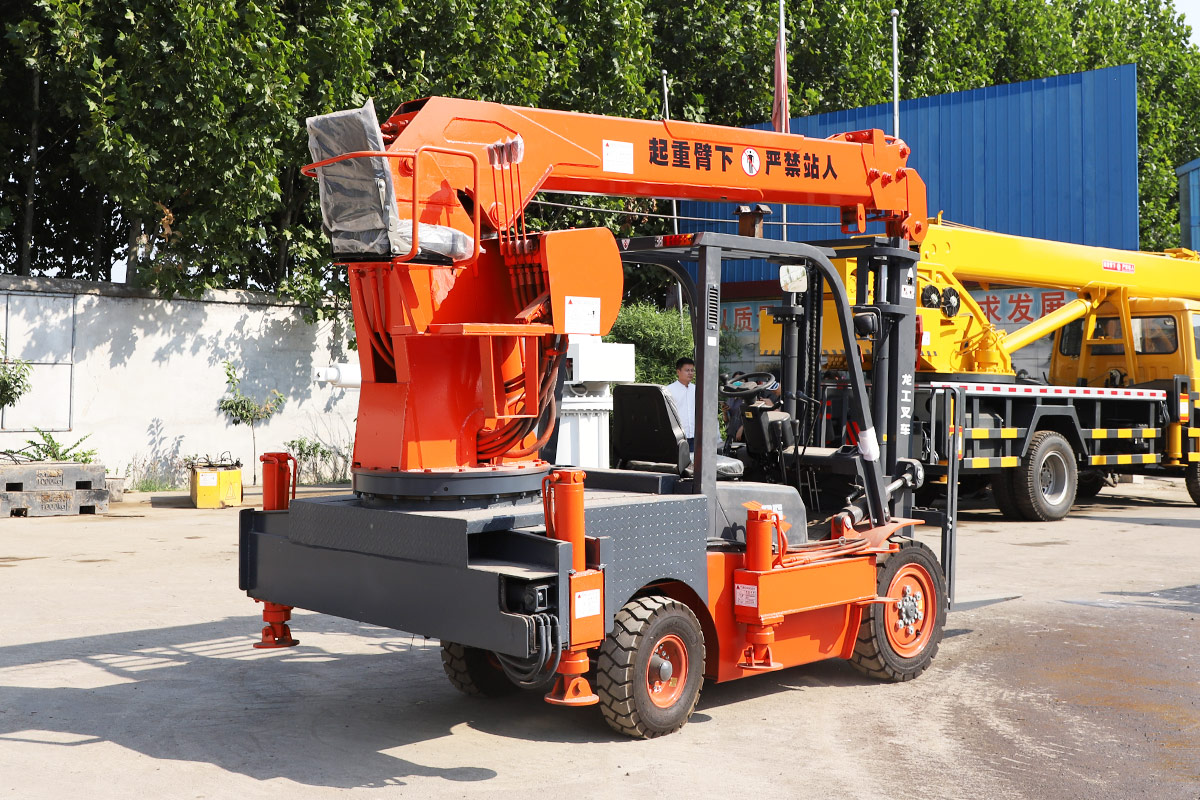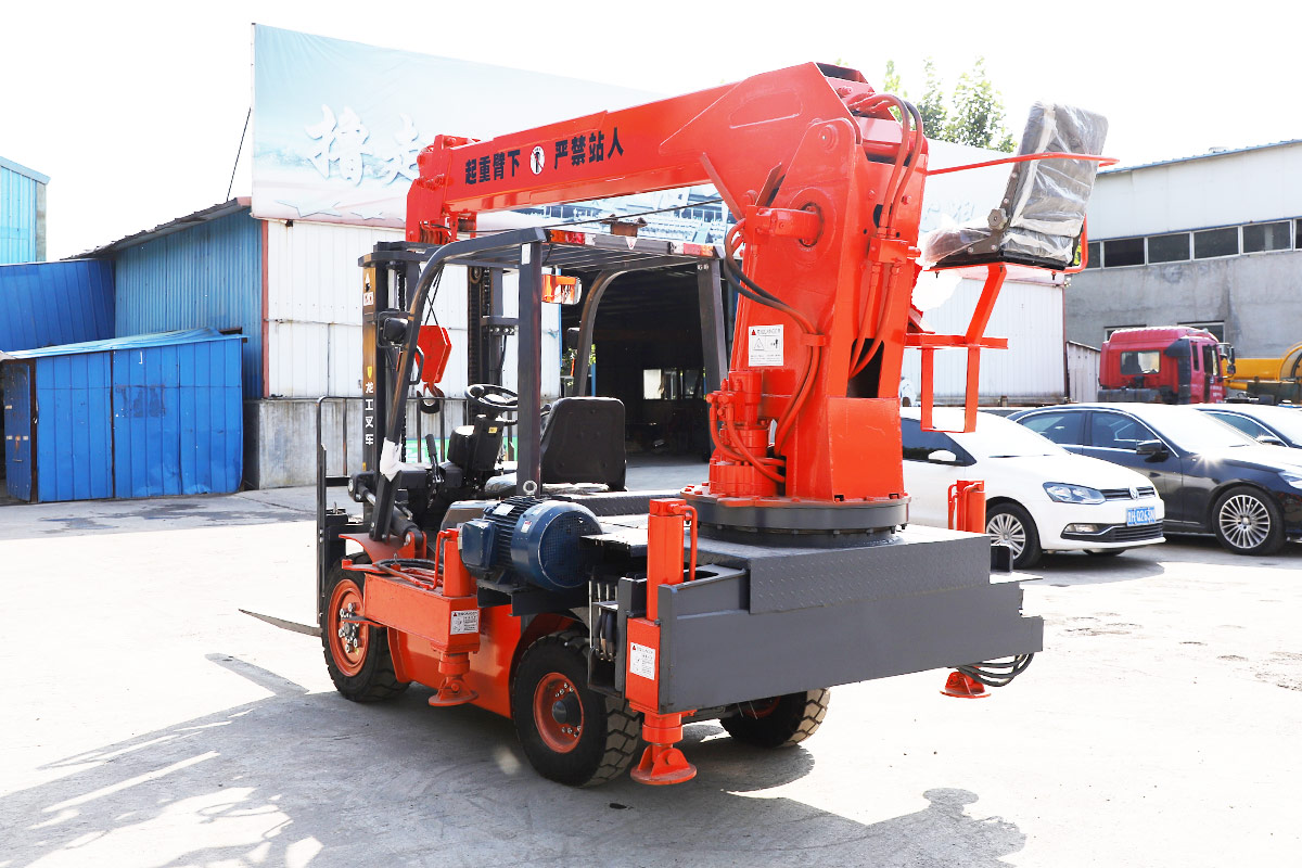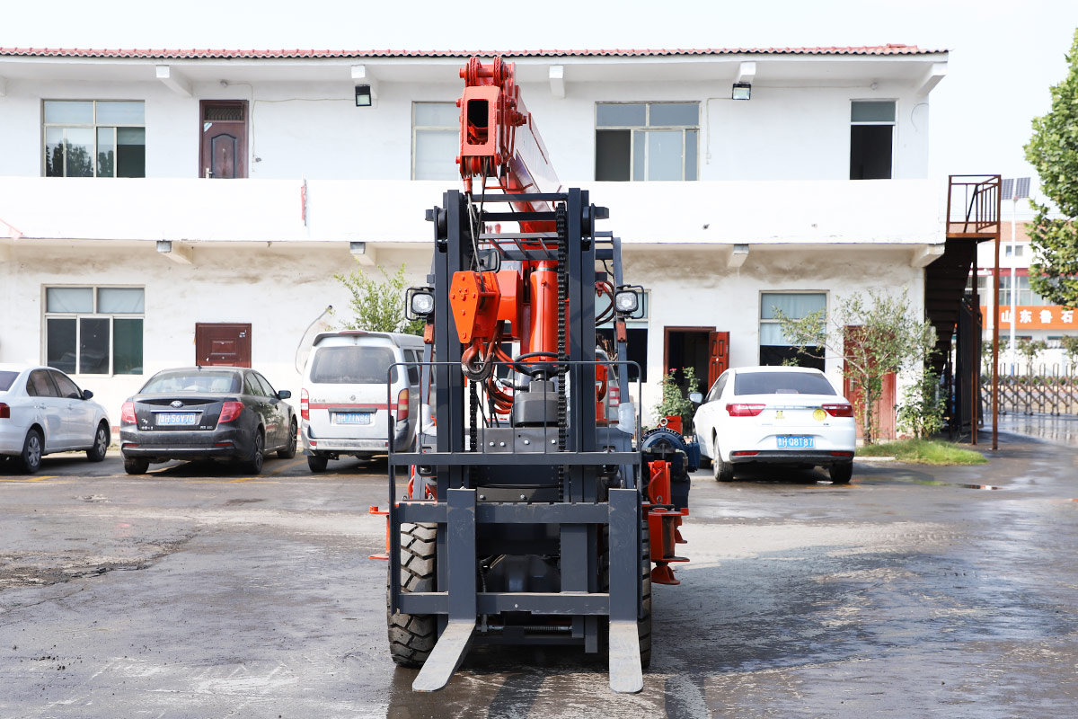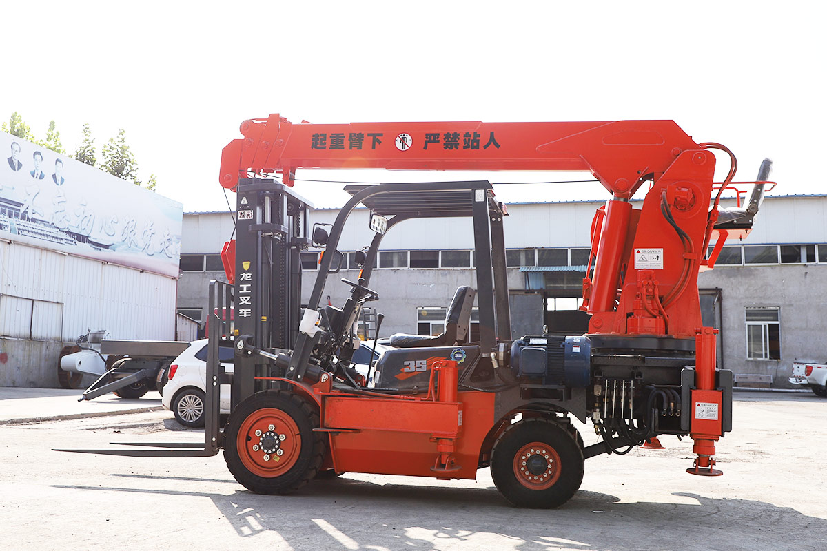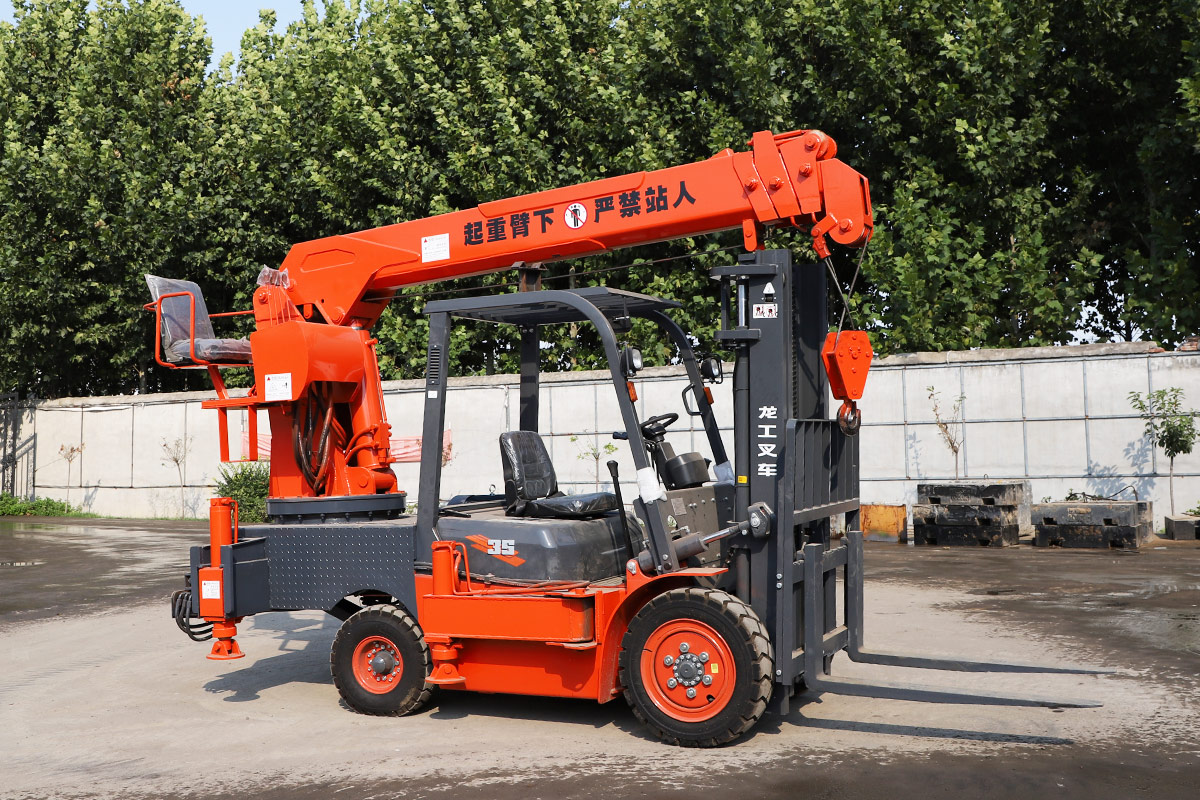 Tento stroj má vpredu vysokozdvižný vozík a vzadu žeriav. Ide o model s dvojitým účelom, ktorý šetrí čas a pracovnú silu.